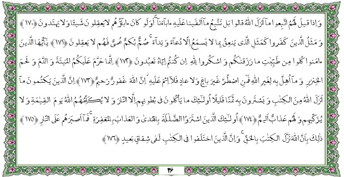 صفحه 26 - سوره بقره - آیات 170 تا 176 وَإِذَا قِيلَ لَهُمُ اتَّبِعُوا مَا أَنْزَلَ اللَّهُ قَالُوا بَلْ نَتَّبِعُ مَا أَلْفَيْنَا عَلَيْهِ آبَاءَنَا ۗ أَوَلَوْ كَانَ آبَاؤُهُمْ لَا يَعْقِلُونَ شَيْئًا وَلَا يَهْتَدُونَ ﴿170﴾ وَمَثَلُ الَّذِينَ كَفَرُوا كَمَثَلِ الَّذِي يَنْعِقُ بِمَا لَا يَسْمَعُ إِلَّا دُعَاءً وَنِدَاءً ۚ صُمٌّ بُكْمٌ عُمْيٌ فَهُمْ لَا يَعْقِلُونَ ﴿171﴾ يَا أَيُّهَا الَّذِينَ آمَنُوا كُلُوا مِنْ طَيِّبَاتِ مَا رَزَقْنَاكُمْ وَاشْكُرُوا لِلَّهِ إِنْ كُنْتُمْ إِيَّاهُ تَعْبُدُونَ ﴿172﴾ إِنَّمَا حَرَّمَ عَلَيْكُمُ الْمَيْتَةَ وَالدَّمَ وَلَحْمَ الْخِنْزِيرِ وَمَا أُهِلَّ بِهِ لِغَيْرِ اللَّهِ ۖ فَمَنِ اضْطُرَّ غَيْرَ بَاغٍ وَلَا عَادٍ فَلَا إِثْمَ عَلَيْهِ ۚ إِنَّ اللَّهَ غَفُورٌ رَحِيمٌ ﴿173﴾ إِنَّ الَّذِينَ يَكْتُمُونَ مَا أَنْزَلَ اللَّهُ مِنَ الْكِتَابِ وَيَشْتَرُونَ بِهِ ثَمَنًا قَلِيلًا ۙ أُولَٰئِكَ مَا يَأْكُلُونَ فِي بُطُونِهِمْ إِلَّا النَّارَ وَلَا يُكَلِّمُهُمُ اللَّهُ يَوْمَ الْقِيَامَةِ وَلَا يُزَكِّيهِمْ وَلَهُمْ عَذَابٌ أَلِيمٌ ﴿174﴾ أُولَٰئِكَ الَّذِينَ اشْتَرَوُا الضَّلَالَةَ بِالْهُدَىٰ وَالْعَذَابَ بِالْمَغْفِرَةِ ۚ فَمَا أَصْبَرَهُمْ عَلَى النَّارِ ﴿175﴾ ذَٰلِكَ بِأَنَّ اللَّهَ نَزَّلَ الْكِتَابَ بِالْحَقِّ ۗ وَإِنَّ الَّذِينَ اخْتَلَفُوا فِي الْكِتَابِ لَفِي شِقَاقٍ بَعِيدٍ ﴿176﴾ و هنگامی که به آنان [که مشرک و کافرند] گویند: از آنچه خدا نازل کرده پیروی کنید، می گویند: نه، بلکه از آیینی که پدرانمان را بر آن یافتیم، پیروی می کنیم. آیا هر چند پدرانشان چیزی نمی فهمیدند و راه [حق را به سبب کوردلی] نمی یافتند [باز هم کورکورانه از آنان پیروی خواهند کرد؟!] ﴿170﴾ داستان [دعوت کننده] کافران [به ایمان]، مانند کسی است که به حیوانی [برای رهاندنش از خطر] بانگ می زند، ولی آن حیوان جز آوا و صدا [آن هم آوا و صدایی که مفهومش را درک نمی کند] نمی شنود. [کافران، در حقیقت] کر و لال و کورند، به همین سبب [درباره حقایق] اندیشه نمی کنند. ﴿171﴾ ای اهل ایمان! از انواع میوه ها و خوردنی های پاکیزه ای که روزی شما کرده ایم، بخورید و خدا را سپاس گزارید، اگر فقط او را می پرستید. ﴿172﴾ جز این نیست که خدا [برای مصون ماندن شما از زیان های جسمی و روحی] مردار و خون و گوشت خوک و حیوانی را که [هنگام ذبح] نام غیر خدا بر آن برده شده، بر شما حرام کرده. پس کسی که [برای نجات جانش از خطر] به خوردن آنها ناچار شود، در حالی که خواهان لذت نباشد و از حدّ لازم تجاوز نکند، گناهی بر او نیست؛ زیرا خدا بسیار آمرزنده و مهربان است. ﴿173﴾ قطعاً کسانی که آنچه را خدا از کتاب [تورات و انجیل به عنوان حلال و حرام] نازل کرده [به سود خود، از بی سوادان یهود و نصاری] پنهان می کنند، و در برابر این پنهان کاری بهای اندکی به دست می آورند، جز آتش به شکم های خود نمی ریزند. و خدا روز قیامت با آنان سخن نمی گوید، و [از گناهان و زشتی ها] پاکشان نمی کند، و برای آنان عذابی دردناک است. ﴿174﴾ اینانند که گمراهی را به جای هدایت، و عذاب را به عوض آمرزش خریده اند، شگفتا! چه شکیبایند بر آتش. ﴿175﴾ آن عذاب به خاطر این است که خدا کتاب آسمانی را به درستی و راستی نازل کرد [ولی اینان، آن را واگذاشتند و در تکذیبش کوشیدند و آن را مایه اختلاف قرار دادند] و یقیناً آنان که در [مفهوم و محتوای] کتاب اختلاف کردند [تا حقایق از مردم پنهان بماند] در دشمنی دور و درازی قرار دارند. ﴿176﴾